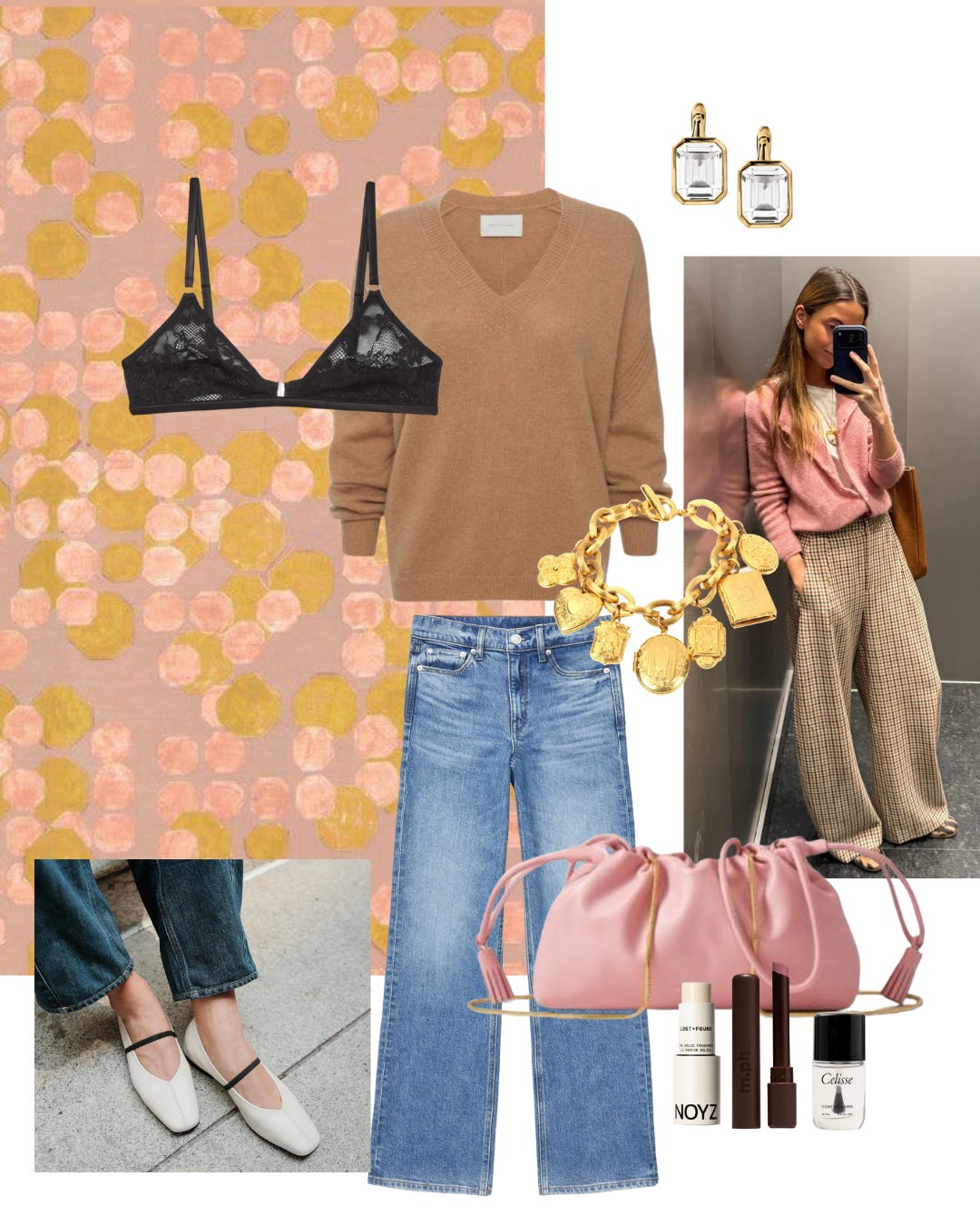 shoes // lipstick // solid fragrance // nail polish // bralette // sweater // denim // charm bracelet // earrings // bag