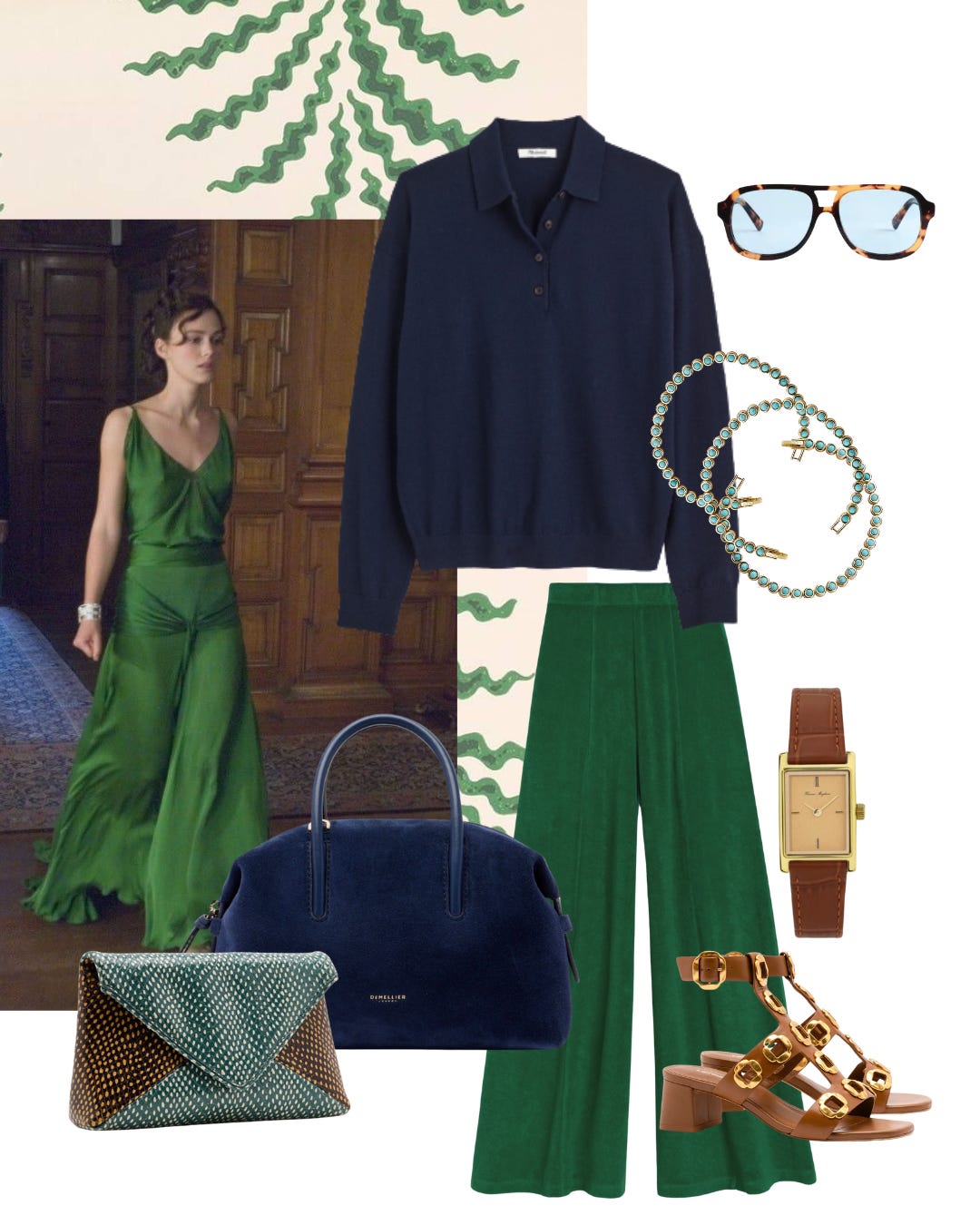 pants // polo sweater // sandals // watch // navy bag // clutch // bracelets // sunglasses